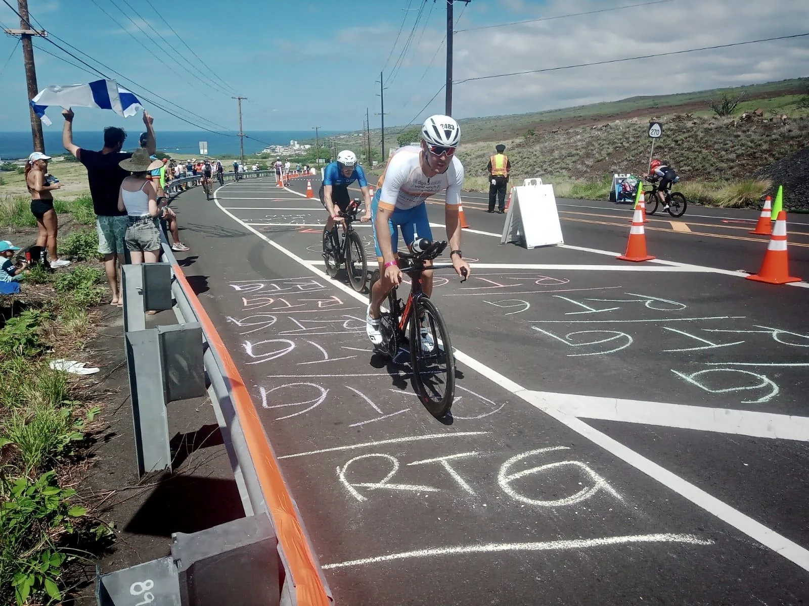 Samstagfrüh um kurz nach 3 Uhr aufstehen, Kaffee und Porridge, ab ins Auto damit wir um 5 Uhr in der Wechselzone sind. Das Rad nochmal checken, Luft aufpumpen, Verpflegung ans Rad. Um 6:50 fiel für mich der Startschuss. Wasserstart am Pier in Kona, mit ca. 400 Athleten aus meiner Altersklasse. Ich kam gut rein und konnte mich gleich im vorderen Teil des Feldes festsetzten. Das Tempo war gut und ich hatte im Wasserschatten keine Probleme. Beim zurückschwimmen wurde es dann etwas chaotischer, da wir auf sehr viele Athleten aus der vorderen Startgruppe aufgeschwommen sind. Mit 57 Minuten kam ich auf Platz 33 relativ entspannt aus dem Wasser und der Wechsel aufs Rad klappte reibungslos. Zuerst musste man eine kleine Schleife durch Kona fahren, bevor es über einen kurzen steilen Anstieg an der Palani Road auf den Highway Richtung Hawi zum Wendepunkt ging. Leider verlor ich durch die vielen Schlaglöcher bereits in Kona meine erste Rahmenflasche mit 2 Stunden Kohlenhydrat-Verpflegung. Backup über Gels hatte ich nur für 1 Stunde an Board. Ich blieb trotzdem konzentriert und versuchte ab dem Highway meinen Rhythmus zu finden. Die Beine fühlten sich gut an und ich fuhr die ersten 60 Kilometer bereits einige Plätze nach vorne. Dann passierte es wieder: meine zweite Rahmenflasche verabschiedete sich bei einer Bodenwelle. Somit hatte ich nach 2 Stunden keine eigene Verpflegung mehr und musste mich mit Kohlenhydraten aus Gels und Gatorade versorgen, das an den Verpflegungsstellen gereicht wurde. Ab dem Anstieg nach Hawi hatte ich dafür eine gute Radgruppe, die ich auf dem Rückweg nutzten konnte um etwas rauszunehmen und Energie zu sparen. Jetzt spürte man auch schon die Hitze und ich versuchte mich konsequent mit Wasser zu kühlen. Der Wind stand gut und wir konnten mit einem 41ger Schnitt nach Kona düsen. Nach 4:38h stieg ich auf Platz 10 vom Rad.